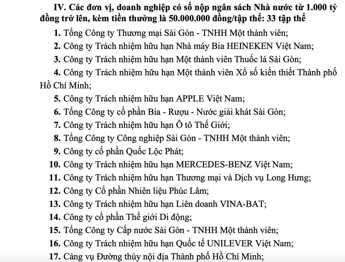 Trong số 33 doanh nghiệp có số thu nộp ngân sách trên 1.000 tỉ đồng này, có nhiều tên tuổi quen thuộc như: Tổng công ty Thương mại Sài Gòn, Công ty TNHH - Nhà máy bia Heineken Việt Nam, Công ty TNHH MTV Thuốc lá Sài Gòn; Công ty TNHH MTV Xổ số kiến thiết TP.HCM; Công ty TNHH Apple Việt Nam; Tổng công ty Rượu - Bia - Nước giải khát Sài Gòn.