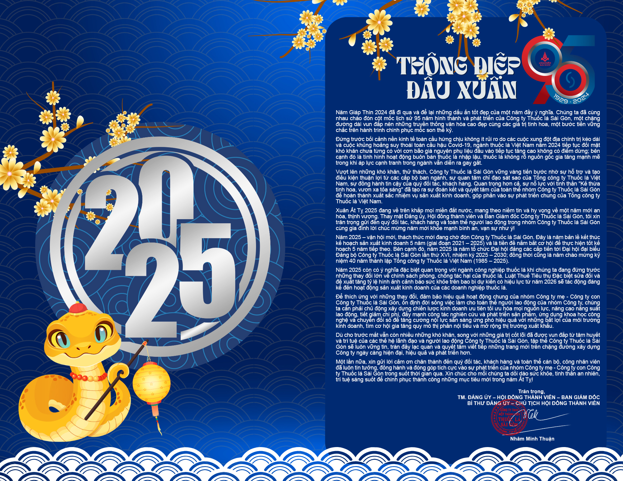 Xuân Ất Tỵ 2025 đang về trên khắp mọi miền đất nước, mang theo niềm tin và hy vọng về một năm mới an hòa, thịnh vượng. Thay mặt Đảng ủy, Hội đồng thành viên và Ban Giám đốc Công ty Thuốc lá Sài Gòn, tôi xin trân trọng gửi đến quý đối tác, khách hàng và toàn thể người lao động trong nhóm Công ty Thuốc lá Sài Gòn cùng gia đình lời chúc mừng năm mới khỏe mạnh bình an, vạn sự như ý!